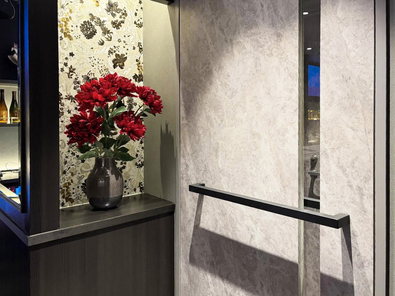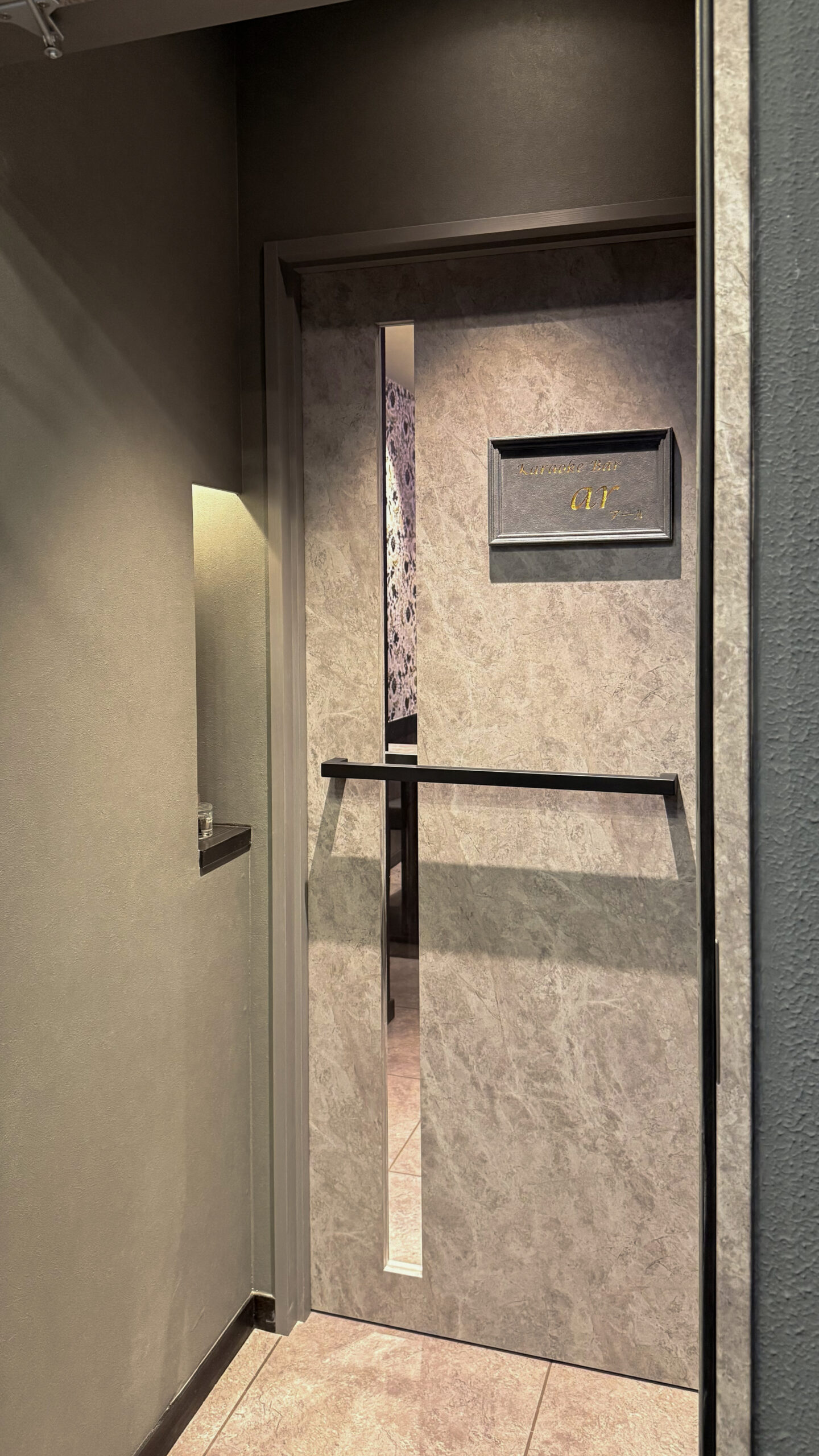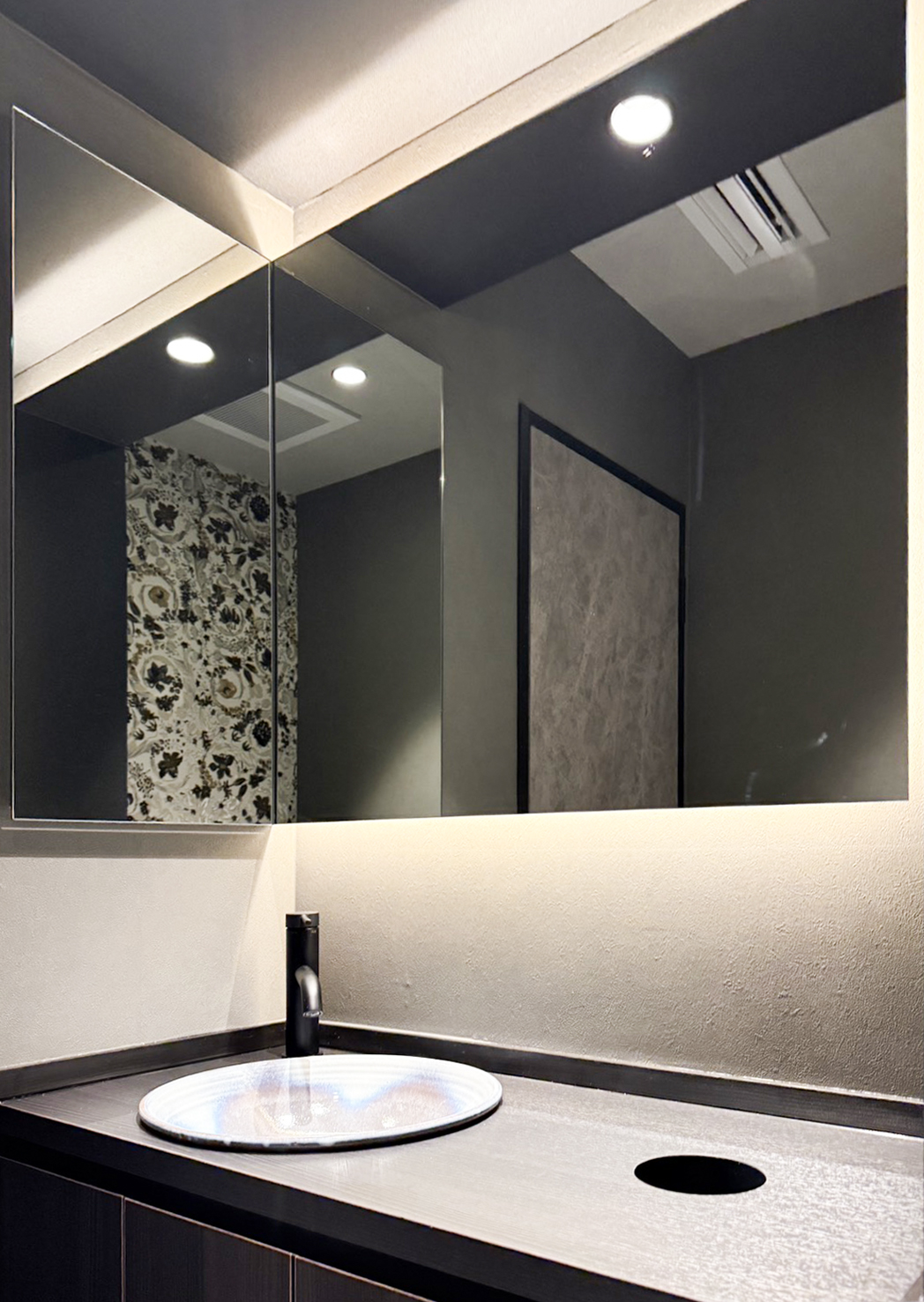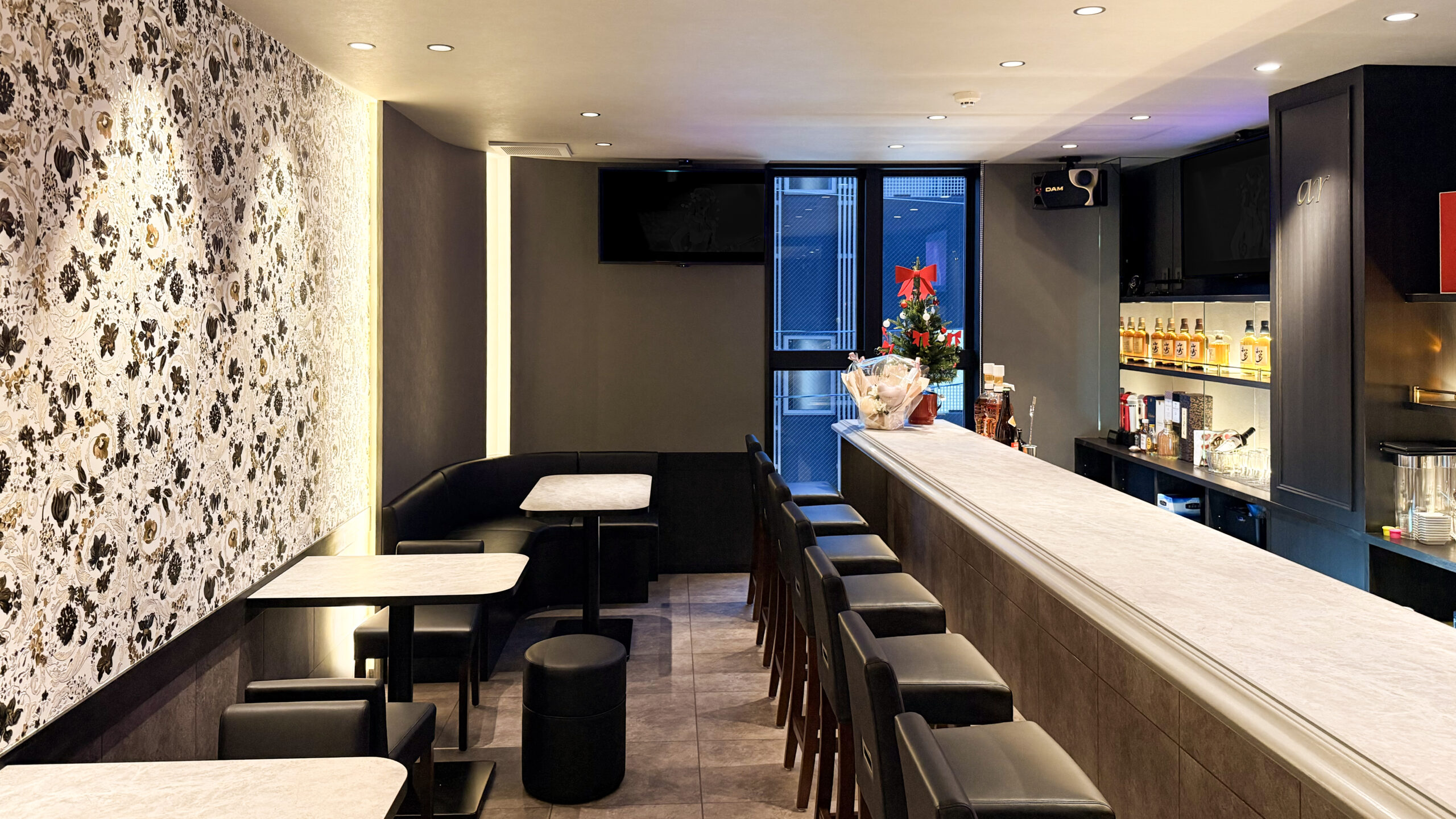 カラオケモニターを併設したカウンターとグレーを基調とした色調が織りなす